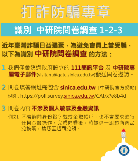 近年臺灣詐騙日益猖獗,為避免會員上當受騙,識別中研院問卷真假的方式如下: